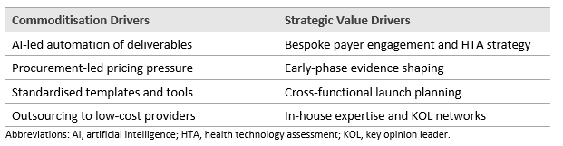 - Standardisation of outputs: Global value dossiers, health technology assessment (HTA) templates, and pricing matrices are increasingly viewed as interchangeable.